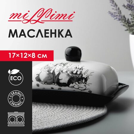 Масленка «Озорные коты» от MILLIMI обеспечивает лучшую сохранность сливочного масла - защищает его от обветривания и света. Вы можете не опасаться - Ваше масло не начнет сразу таять, когда Вы достанете его из холодильника. Приятная особенность керамики, её низкая теплопроводность - она долго сохраняет как тепло, так и холод. Поэтому Ваше масло всегда будет максимально свежим. Специальная рифленая поверхность дна масленки предотвратит скольжение масла во время его разрезания.