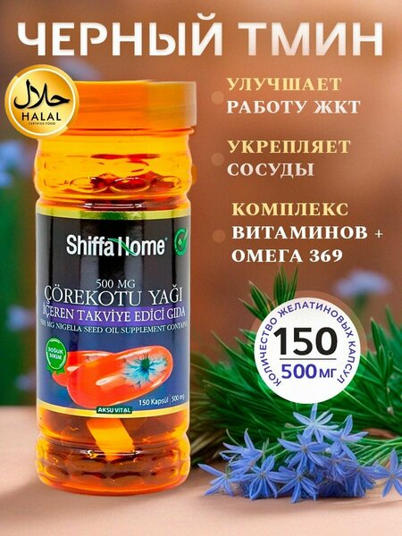 Масло черного тмина - уникальный продукт, положительно влияющий на все органы и системы человека. Shiffa Home это эталонное турецкое масло в капсулах, известное своими лечебными свойствами. Благодаря методу прессования (холодного отжима), масло семян черного тмина сохраняет 90% полезных веществ. Среди них: витамины группы В, витамин А, С, Е, D, омега 3 6 9, калий, кальций, магний, фосфор, жирные кислоты, аминокислоты, флавоноиды, сахариды, эфиры и многое другое. Медь - участвует в сотнях внутренних реакций, входит в состав ряда важнейших ферментов, задействована в процессах синтеза коллагена и эндорфинов. Фолиевая кислота - для создания и поддержания в здоровом состоянии новых клеток, необходима для нормальной выработки сперматозоидов. Витамин E – антиоксидант, улучшает циркуляцию кислорода в организме. Витамин K - участвует в работе почек, печени, желчного пузыря, предотвращает остеопороз. Пальмитолеиновая кислота (Омега-7) - полезна для здоровья кожи, защищает желудочно-кишечный тракт. Бегеновая (докозановая) кислота - для укрепления волос, предотвращает их выпадение и стимулирует рост новых. Цервоновая кислота (Омега-3) - положительно влияет при таких заболевания, как гипертония, артрит, атеросклероз, депрессия, сахарный диабет, инфаркт, инсульт. Аргинин - мощный иммуномодулятор, стимулирует выброс гормона роста и омоложение организма, отвечает за состояние хрящей и мышц. Валин - жизненно важен для синтеза и роста тканей тела. Гистидин - используется при лечении ревматоидных артритов, язв, анемии, нарушений слуха. Лейцин – источник энергии, снижает уровень сахара. Треонин - незаменимая аминокислота, входит в состав коллагена и эластина, участвует в формировании зубной эмали, выработке антител, метаболизме жиров. Тирозин - способствует уменьшению жировых отложений, улучшает функции надпочечников и щитовидной железы, улучшает настроение. Клетчатка - обеспечивает нормальное пищеварение и моторику кишечника, нормализует микрофлору. Инулин - служит в качестве пребиотика, способствует нормализации уровня сахара в крови. Всего 12 витаминов, 6 макроэлементов, 5 микроэлементов, 15 видов жирных кислот и 17 аминокислот! Такому составу позавидует любой известный витаминно-минеральный комплекс! Черный тмин в капсулах 500 мг позитивно сказывается на работе сердца и нервной системы. Делает стенки сосудов прочнее и эластичнее, препятствуют образованию тромбов, а также снижает риск развития панкреатита, инфаркта и онкологий. Отлично восстанавливает репродуктивную систему, нормализует менструальный цикл, устраняет синдром пмс. Способствует снятию воспалений в органах малого таза при цистите и простатите. Увеличивает либидо и продолжительность полового акта. Помогает спортсменам на тренировках, увеличивает выносливость, помогает наращивать мышечную массу, восстанавливает организм после физических нагрузок. Средство используется как витамины для иммунной системы в осенне-зимний период, защищает от вирусов, инфекций и бактерий. Помогает быстрее восстанавливать силы в период болезни и после операций. Масло черного тмина не зря считают рецептом долголетия. Его химический состав поддерживает работу мозга, памяти, внимания. Поэтому препарат так полезен пожилым людям.