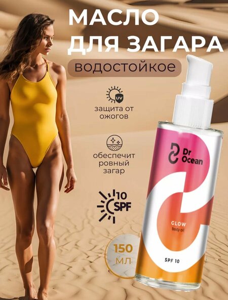 Dr.Ocean представляет солнцезащитное масло для интенсивного загара на солнце и в солярии. Состав шести масел полноценно увлажняют кожу, обеспечивая насыщенный безопасный загар. Подсолнечное масло обладает смягчающими и регенерирующими свойствами. Масло виноградной косточки не только омолаживает кожу, но и повышает ее тонус и упругость, эффективно увлажняет глубокие слои эпидермиса, сохраняя и восстанавливая естественную влажность. Оливковое масло повышает эластичность кожи, очищает от старых клеток, защищает от солнца, раздражений и спасает от ожогов. Миндальное масло придает коже здоровый и красивый вид, оказывает питающее, омолаживающее, увлажняющее и противоожоговое действие. Масло облепихи эффективно увлажняет, питает и смягчает, насыщает клетки витаминами, способствует процессам восстановления, выравнивает тон и повышает защитные возможности эпидермиса. Масло жожоба обеспечивает защитный слой на коже, питает и увлажняет кожу. Увлажняющее масло для тела подойдет в качестве подарка женщинам и мужчинам.