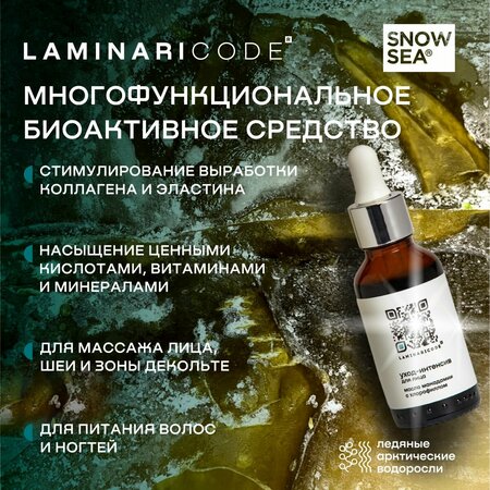 Анонс: стимулирование выработки коллагена и эластина. Масло макадамии с хлорофиллом Уход-интенсив LAMINARICODE® - многофункциональное биоактивное средство, которое отлично подойдет для домашнего ухода за кожей лица, шеи и области декольте, а также для ухода за ногтями и волосами. Идеально сбалансированная композиция драгоценного масла макадамии и медных производных хлорофилла обеспечивает мощную подпитку клеток эпидермиса ценными кислотами, витаминами и минералами, ускоряет выработку коллагена и эластина. Масло смягчает кутикулу и укрепляет ногтевую пластину, склеивает секущиеся кончики волос, придает им блеск и упругость. Полностью натуральный состав, быстро впитывается, не закупоривает поры, имеет красивый изумрудный цвет. SNOW SEA® - новое имя любимого бренда АВ1918. Меняемся, чтобы стать лучше. Вдохновлённые эффектом замедления времени на орбитальной станции, работники которой стареют медленнее землян из-за её быстрого движения вблизи массивного объекта с сильной гравитацией — нашей Земли, мы создали крем, чтобы перехитрить возрастные изменения и гравитационное старение (птоз). Ламинария не только кодовое слово в системе ценностей нашего бренда. Это растение само является живой галактикой витаминов, минералов и полисахаридов. Она поможет расшифровать код вашей молодости и замедлить течение времени — в галактике Ламинария земные годы над красотой не властны. Активные компоненты: Масло макадамии богато полезными для кожи жирными кислотами (олеиновая, стеариновая, линолевая), витаминами (Е, А, В1, В2, В5, В6, В12 и РР) и минералами (селен, калий, медь, цинк, магний). Великолепно питает кожу, разглаживает мелкие морщинки. Медные производные хлорофилла (МПХ – продукт переработки арктической ламинарии) глубоко увлажняют кожу. LAMINARICODE® - секретный код вашей молодости! Размер: 11x4x4 cm.