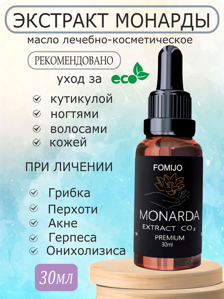 Один экстракт от всех недугов. Это универсальное средство, которое можно использовать для кожи головы, лица, рук, ног и ногтей. Помогает при грибке ногтей, отслоении, ломкости. При сухости кутикулы. При перхоти. повышенной сальности, при выпадении волос. при псориазе, куперозе, дерматите. микозе, кератоз. лишае, экземах, бородавках. угревой сыпи. при простуде, вирусном и бактериальном заболевании, папилломы. при ранах, укусах, ожогах. Профессиональное средство Масло Монарды давно зарекомендовало себя как мощное бактерицидное, противогрибковое, антивирусное и косметическое средство. Экстракт монарды эффективно борется с микробами, грибковыми поражениями, перхотью, аллергией, герпесом, акне и постакне, угревой сыпью. Положительно влияет на восстановление и рост ногтей, повышают плотность пластины, устраняют ломкость. Масло не создает липкой пленки, легко смывается или удаляется салфеткой. Быстро впитывается, не оставляя жирного блеска, подходит для ежедневного использования, особенно для сухой и склонной к шелушению кожи. Регулярное применение способствует обновлению клеток организма и замедляет процесс старения благодаря антиоксидантным свойствам, рекомендовано при увядающей коже и первых признаках старения. Обладает омолаживающим свойством и разглаживает морщины. Экстракт монарды успокаивает воспаления и очищает лицо от прыщей и воспалений (для проблемной, жирной и комбинированной кожи). Масло против онихолизиса отлично заживляет ранки и трещины, восстанавливает ногти после наращивания, устраняет зуд и шелушения. Оказывает уход за ногтями после гель лака. Подходит как лечебное масло для ногтей. Противовоспалительное средство заживляет раны, укусы и ожоги. Монарда подходит для рук и ног, великолепно борется с бактериальной и грибковой микрофлорой, укрепляет ногтевую пластину, оказывает бережный уход за кутикулой. Помогает при таких проблемах, как грибковое поражение ногтей, онихолизис, герпес. Уходовое средство избавляет от трещин и сухих мозолей.