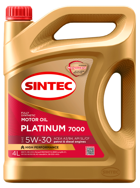 Cинтетическое моторное масло Sintec Platinum 7000 5W-30 A3/B4 SL/CF предназначено для применения в современных высоконагруженных бензиновых и дизельных двигателях легковых автомобилей, микроавтобусов и малотоннажных грузовых автомобилей, где требуется уровень эксплуатационных свойств API SL/CF и ACEA A3/B4. Производится с использованием фирменной технологии Molyguard. Предназначено для бензиновых и дизельных двигателей широкого парка легковых автомобилей, внедорожников, микроавтобусов и легких коммерческих автомобилей, когда требуется масло вязкостью SAE 5W-30 и уровня эксплуатационных свойств ACEA A3/B4, API SL или более ранних спецификаций. До конца сентября 2021 масло производилось с допуском SN. Обращаем ваше внимание, что на нашем сайте обновлены фотографии канистр и наименования продукции Sintec в связи с ребрендингом. Некоторые масла поступают в "старой" таре, до выработки остатков упаковки на производстве. Состав продуктов в новой и старой упаковках полностью идентичен.