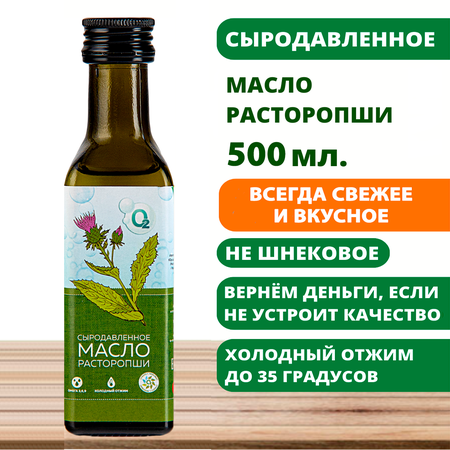 Масло расторопши холодного отжима нерафинированное сыродавленное. Масло получено путём холодного отжима гидравлическим прессом в бочонке, без использования химических веществ и применения температуры, поэтому и Сыродавленное. Соответственно - это масло сохранило все питательные вещества, заложенные природой, а что ещё более важно, не получило в свой состав канцерогенов, выделяющихся при нагреве. Масло Расторопши -это ценнейший продукт, имеющий в своём составе редчайшее вещество силимарин, которое оказывает благоприятнейшее воздействие на печень, желчь и желудочно-кишечный тракт. Принимать можно по 2-3 десертные ложки в сутки во время или после еды. Масло расторопши традиционно используется: в качестве источника ПНЖК Омега-6, Омега - 3; в качестве ранозаживляющего средства; для нормализации холестеринового обмена; для снижения риска развития атеросклероза. Для снижения риска развития сердечно-сосудистых заболеваний; для усиления образования желчи и ускорения ее выведения; для стимулирования иммунитета. Силимарин – редкий компонент природной аптеки. Укрепляет и регенерирует клеточные мембраны. Идеален для печени по синтезу белка и нейтрализации ядов. Нормализует жировой обмен, выводит из организма холестерин, без оседания на стенках сосудов. Жирные кислоты Омега 6 и Омега 9 – укрепляют иммунитет, выводят токсины из организма. При химических отравлениях очищают печень. Помогают липидному и гормональному балансу организма. Для дополнения организму жирных кислот Омега 3 можно включить в рацион питания - льняное масло вологодское холодного отжима. Природные антиоксиданты и витамины – останавливают воспаления, инфекции, онкологию. Ускоряют синтез гемоглобина, усиливают мозговую деятельность. Улучшают зрение и кожные покровы. Подходят для синтеза инсулина организмом, нормализации клеточных процессов. Покоритель медицины - отсутствие побочных эффектов и противопоказаний разрешает применять масло растительное расторопши во всех отраслях медицины: лечение и очистка печени; улучшения работы сердечной мышцы; профилактика и лечение атеросклероза; гинекология и нормализация мужского здоровья; регенерация кожи и слизистой; - стоматология. Масло расторопши холодного отжима подходит для профилактического приема в домашних условиях. Полезно для заправки салатов, добавления в соусы и кондитерские блюда. - Целебно работникам вредных производств и жителям экологически загрязненных районов. - Масло в десятке приоритетных косметологических препаратов самостоятельного применения. - Прием внутрь беременным женщинам, людям с острыми и хроническими болезнями без консультации врача не желателен. Попробуйте также наши очень вкусные и полезные масла: масло кунжутное, горчичное.