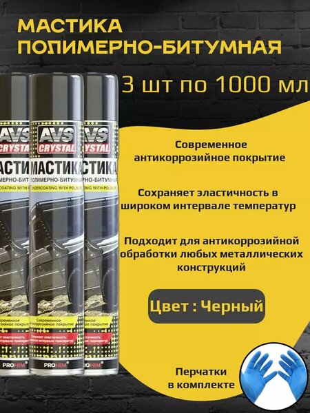 Полимерно-битумная мастика AVS предназначена для антикоррозийной обработки наружных поверхностей автомобиля (колесные арки, пороги, днище и т. д.). Незаменимое антикоррозийное средство для обработки любых металлических конструкций (трубы горячего и холодного водоснабжения, металлические ограды и т. д.). Обладает повышенными свойствами защиты от воздействия камней, песка, влаги, дорожных реагентов и других агрессивных химических веществ. • Современное антикоррозийное покрытие • Сохраняет эластичность в широком интервале температур • Подходит для антикоррозийной обработки любых металлических конструкций