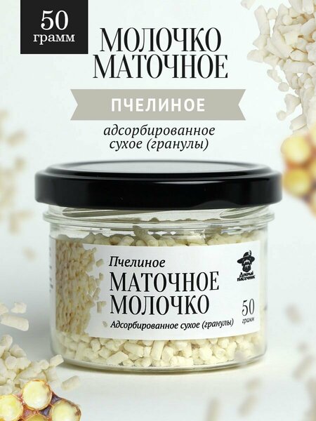 Маточное молочко является одним из наиболее ценных продуктов пчеловодства. Это пища, которой пчелы кормят новорожденных личинок и матку. Маточное молочко сухое в гранулах получается путем процесса адсорбции натурального пчелиного молочка, который помогает сохранить полезные свойства данного продукта. В процессе адсорбции из маточного молочка удаляется избыточная влага. Этот процесс позволяет сохранить все полезные компоненты маточного молочка и продлить его срок годности. Маточное молочко пчелиное богато различными витаминами, минералами и аминокислотами, которые положительно влияют на здоровье человека. Оно используется в медицине и косметологии в качестве природного биологически активного вещества. Сухое адсорбированное маточное молочко является удобной формой для хранения и использования и может быть использовано в качестве добавки к пище. Маточное молочко обладает рядом полезных свойств для человека. Оно укрепляет иммунную систему, помогает восстанавливаться после болезни или стресса, повышает выносливость, улучшает память и концентрацию внимания. Также маточное молочко способствует улучшению работы сердечно-сосудистой системы, нормализации обменных процессов в организме, улучшает общую физическую и психическую работоспособность. Применение: по 0,5 - 1 г под язык до полного рассасывания 1-2 раза в сутки в течение 2-3 недель, курс - 2 раза в год. Противопоказания: индивидуальная непереносимость