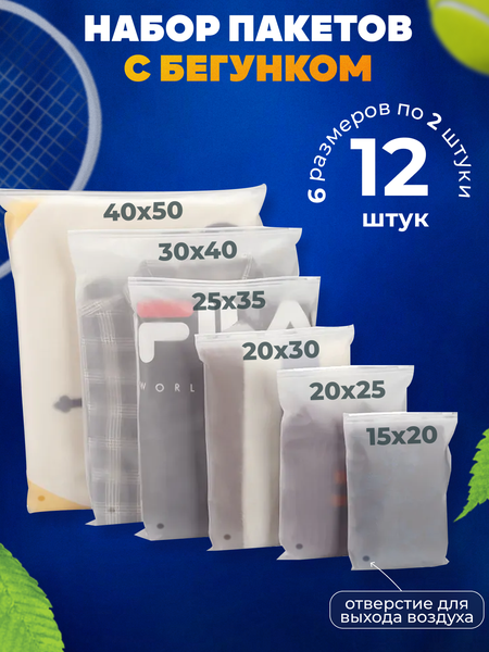 Набор матовых пакетов с бегунком и воздушным клапаном состоит из пакетов разных размеров: 15х20 см - 2 шт, 20х25 см - 2 шт, 20х30 см - 2 шт, 25х35 см - 2 шт, 30х40 см - 2 шт, 40х50 см - 2 шт. В упаковке 12 шт. Плотность 60 мкм на каждую сторону. Общая плотность 120 мкм. В пакетах имеется воздушный клапан (отверстие) для выхода воздуха, необходимый для экономии места при упаковке в короба и защиты от разрывов из-за лишнего воздуха. Зип пакеты с бегунком позволяют вам использовать их для широкого спектра задач, от организации путешествий и поездок до хранения и сортировки вещей в доме или офисе. Аналогично при использовании в качестве пакетов в чемодан. Если ищите зип пакеты в роддом, то наши наборы пакетов разных размеров - идеальный вариант. Вы сможете удерживать свои вещи в безупречном порядке и с легкостью найти нужный предмет. Пакеты в роддом от AllPackIn станут незаменимыми и в будущем, т. к. многоразовые. Вы так же сможете их использовать для размещения и хранения вещей дома, для памперсов, игрушек и любых других принадлежностей. Пакеты для путешествий позволяют сохранять порядок в чемодане и легкий доступ к вещим. Их практичность и особый тип замка позволили им решать самые востребованные и популярные упаковочные задачи, как для потребителя, так и для производителя. Матовые пакеты для обуви удобны в качестве дополнительной упаковки на время хранения или транспортировки. Zip пакеты с бегунком сделаны из прочного материала ЕВА, который не токсичный и гипоаллергенный, повышенной прочности. Наша компания гарантирует высокое качество и доступные цены на зип пакеты.