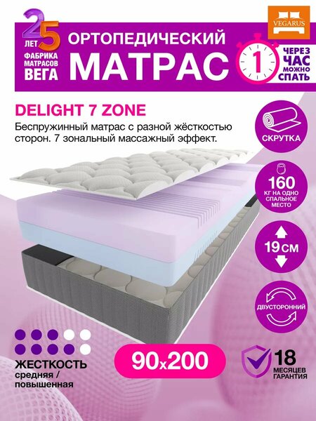 Матрас на кровать в рулоне Delight 7 zone с наполнителем Ella Block и Ella Block Hard имеет двустороннее основание средней и повышенной жёсткости с массажным эффектом. Матрас ортопедический имеет размеры 1 спальный. Матрас спальный разделен на 7 зон нагрузки с эффектом релакс. Матрас беспружинный и в районе плеч имеет более мягкую плотность, в районе поясницы более жесткую. Лёгкая и упругая ультрасовременная пена подарит комфортное состояние отдыха, способствует улучшению сна, снимет утомляемость и напряжение. Матрасы для кровати или для дивана или как самостоятельное место для сна на полу. Высокотехнологичная средней и повышенной жёсткости пена EllaBlock Hard с анатомическим эффектом принимает форму тела, быстро восстанавливается. Матрас поролоновый на кровать разделен на 7 зон жесткости от мягкий до жёсткий. В матрасе присутствует гипоаллергенный синтепон, спанбонд и несъемный чехол. Для долгой службы матраца в изготовлении чехла (верхнего слоя) используется трикотаж высокого качества, а периметр из жаккарда усилен дополнительным слоем поролона. Матрас анатомический прослужит долго при постоянных высоких нагрузках, так как имеет повышенную устойчивость к износу. Все материалы антистресс, гипоаллергенны, что даёт возможность применять не только для взрослых, но и для детей и людей с чувствительным организмом. Отличное решение в спальню и в детскую комнату, для дома и дачи. Матрас односпальный 90х200. Можно использовать матрас на диван, это позволяет сделать высота 19 см.