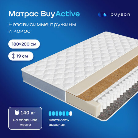 Высокий односторонний матрас buyson BuyActive (19 см) обеспечивает точечную и правильную поддержку позвоночника (ортопедический эффект). Независимый пружинный блок Pocket усилен за счет увеличения толщины проволоки, что повышает жесткость матраса. Также за дополнительную жесткость отвечает слой натурального кокоса. Это натуральное природное волокно отличается прочностью и эластичностью, хорошо пропускает воздух и устойчиво к влаге. Матрас прекрасно подойдет людям с большой массой тела, а также парам: все пружины автономны, что нивелирует колебания с противоположной стороны. Слой хлопкового войлока изолирует и амортизирует пружины, а также выполняет роль терморегулятора: способствует хорошему воздухообмену летом (больше прохлады), а зимой помогает сохранить тепло. Пена AirFoam выполняет роль комфортного слоя. Матрас байсон доступен в 5 размерах. Если вам нужен матрас на двуспальную кровать, выбирайте размеры 140х200, 160х200 или 180х200 см. Для односпальной кровати подойдут варианты 80х200 или 90х200 см. В дополнение можно купить наматрасник или защитный чехол, а также готовые сеты: одеяло и подушки. Спи комфортно, просыпайся полным сил: быстрое и доступное решение для качественного сна. Пружинный матрас доставляется в скрученном виде (в рулоне). После вскрытия упаковки матрас в скрутке полностью распрямится и восстановит свою форму в соответствии с заявленным размером через 72 часа. Спать на матрасе можно сразу же после распаковки.