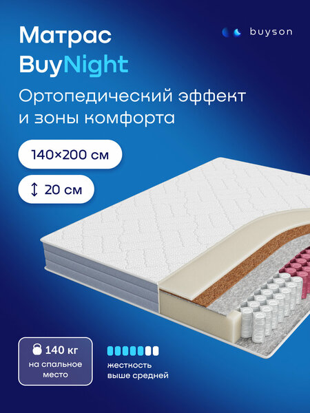 Матрас BuyNight – полноценное ночное восстановление подарит еще больше сил для нового, продуктивного дня! Независимые пружины, слой натурального кокоса и жесткость выше среднего – прекрасный вариант для тех, кому важен ортопедический эффект. Оптимально упругий и для взрослых, и для детей. Зонирование матраса обеспечивает более точечную поддержку позвоночника. Спальная поверхность BuyNight разделена на 3 зоны комфорта – для головы, средней части тела и ног. У каждой своя степень упругости, с усилением в центральной части, на которую приходится самый большой вес. Все пружины автономны – это нивелирует колебания на противоположной стороне. Дополнительное усиление пенным коробом по краям. Кокосовый слой усиливает жесткость матраса и улучшает микроклимат спального места. Натуральное природное волокно – кокосовая койра – отличается прочностью и эластичностью, хорошо пропускает воздух и не боится влаги. Пена AirFoam – верхний комфортный слой – адаптируется под изгибы тела, что удобно для сна в любой позе: на животе, спине или на боку. Инновационная дышащая формула пенного наполнителя AirFoam: благодаря повышенному количеству пор, циркуляция воздуха в 2 раза лучше, что делает спальное место еще гигиеничнее и комфортнее с точки зрения температурного режима. Безопасность и гипоаллергенность пены подтверждены международным сертификатом CertiPUR. Два слоя хлопкового термовойлока продлевают срок службы матраса и поддерживают оптимальный микроклимат: когда жарко, войлок дает ощущение прохлады, а в морозы, наоборот, помогает сохранить тепло. Стеганый чехол матраса сшит из приятного на ощупь белоснежного трикотажа c воздушным наполнителем на основе полиэфирного волокна и пены. Внизу предусмотрена смотровая молния – можно увидеть слои матраса. Матрас односторонний, не требует переворачивания «верх/низ». Гипоаллергенный состав. Нагрузка до 140 кг на спальное место. Гарантия 3 года. Этот товар приедет к вам в компактном, скрученном виде, без проблем поместится в легковой автомобиль – удобно для транспортировки, идеально для дома и дачи. После вскрытия упаковки матрас в скрутке полностью распрямится и восстановит свою форму в соответствии с заявленным размером через 72 часа. Важно: при использовании матраса на кровати с реечным дном (с гибкими ламелями), убедитесь, что максимальное расстояние между рейками не превышает 8 см, иначе возможна деформация матраса. Все матрасы buyson прекрасно сочетаются с кроватями нашего бренда. Матрас 140 на 200 см подходит на двуспальную кровать с таким же размером спального места. Габариты матраса (длина х ширина х высота) могут меняться в рамках разрешенного допуска +-1,5 см. Производитель оставляет за собой право вносить изменения в конструкцию изделия, не ухудшающие его потребительских свойств.