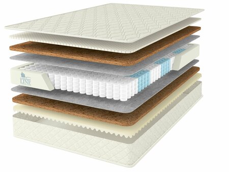 Матрас идеально подходит для людей с большим весом. Пружинный блок S1000 (1000 пружин на спальное место) способен оказывать деликатную, ортопедическую поддержку позвоночнику. Одна сторона модели очень ровная и жесткая, изготовлена из блока натуральной кокосовой койры. Обратная поверхность мягче, за счет использования тонкого слоя натурального латекса. Кокос и латекс натуральные, дышащие материалы, абсолютно безопасны и не способны вызывать аллергические реакции. Обивка матраса изготовлена из жаккарда, стежка на синтепоне придает поверхности дополнительный уют и комфорт. Чехол. Натуральный латекс 1 см. Кокосовая койра - латексированное кокосовое волокно 2 см. Термопресованный войлок от 0,5 см. Независимый пружинный блок Мультипакет ("Multipocket S1000". Усиление "пенополиуретан по периметру"). Термопресованный войлок от 0,5 см. Кокосовая койра - латексированное кокосовое волокно 2 см. Латекс искусственный - анатомическая пена 1,5 см ("RelaxFoam". С массажным эффектом). Чехол.