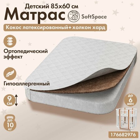 Матрас детский, для новорожденных ортопедический SoftSpace, со съемным чехлом, беспружинный, прямоугольный с закругленными углами, из холлофайбера и кокоса, 85х60 см
