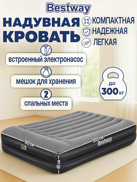 Представляем надувную кровать BESTWAY размером 152х203х46 см с подголовником — идеальное решение для комфортного отдыха как дома, так и в палатках. Эта двуспальная надувная кровать модели 67403 выполнена по технологии I-Beam Construction, которая обеспечивает надежную поддержку и равномерное распределение веса до 300 кг. Удобный подголовник и флокированное покрытие, напоминающее мягкую замшу, делают её идеальной для сна, предотвращая скольжение постельного белья. Встроенный насос 220В надувает и сдувает матрас за считанные минуты, позволяя легко регулировать его упругость. Не переживайте, если электричества не будет — специальный клапан позволяет использовать обычный механический насос. В комплекте с надувной кроватью идёт удобная сумка для хранения и самоклеящаяся заплатка для ремонта. Эта надувная кровать станет отличным выбором для тех, кто ценит комфорт и практичность в одном решении. Создайте идеальное место для сна с матрасом 2х спальным, без лишних забот! • Тип товара: Надувная кровать. • Максимальная нагрузка: 300 кг. • Возраст: -. • Количество в комплекте: 1 шт. • Особенности: встроенный электронасос. • Комплектация: насос, сумка. • Длина: 203 см. • Ширина: 152 см. • Высота: 46 см. • Цвет: черно-серый. • Материал: ПВХ. • Упаковка: Картонная коробка. • Артикул производителя: 680168.