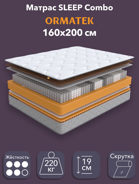 Матрас 160х200 SLEEP Combo - комбинированной жесткости на основе 9-зонального блока независимых пружин обеспечивает комфортную и надежную поддержку позвоночника в естественном положении и снимает мышечное напряжение. Каждая пружина в нем работает индивидуально и обеспечивает точечную зональную поддержку тела во время сна и отдых, создавая ортопедический эффект. Со стороны высокой жесткости в качестве наполнителя используется латексированная кокосовая койра, обеспечивающая надежную поддержку и заботу о здоровье позвоночника. Кокос придает дополнительную жесткость спальному месту, хорошо пропускает воздух и обладает антибактериальным эффектом. Со стороны средней жесткости в качестве наполнителя используется Ormafoam с массажным эффектом, который дарит максимальное расслабление мышц, способствуя быстрому погружению в сон. Матрас пружинный подходит для тех, кто хочет менять комфортность спального места или не знает, какая жесткость ему подойдет. Размер SLEEP Combo 160 на 200 см, отлично подойдет как матрас на кровать размером 160х200 см. Анатомический Матрас имеет высоту 19 см, скручен в рулон и помещен в вакуумную упаковку, легкий, удобен в транспортировке. Диаметр рулона, в упакованном виде составляет 40 см, длина — 160. После распаковки матрас восстанавливает форму в течение 24 часов. Преимущества модели: Разная жесткость сторон позволит подобрать нужный уровень комфорта и поддержки (ниже средней и высокая) 9-зональный пружинный блок обеспечит комфорт и правильную поддержку позвоночника Дарит расслабление благодаря пене с микромассажным эффектом Кокосовая койра придает матрасу повышенную жесткость, прослужит долгие годы и позаботится о здоровье позвоночника Хлопковый чехол с мебельным бурлетом Поставляется в рулоне для легкой транспортировки Состав: Пена Convoluted Ormafoam — позволяет спать с максимальным удобством и дарит микромассажный эффект. Spunbond (Спанбонд) — легкий, тонкий и прочный нетканый материал. Способствует равномерному распределению нагрузки на пружинный блок и надежно предохраняет наполнители от изнашивания под воздействием пружин. Блок независимых пружин EVS 500 9 zone — девятизональный пружинный блок, где на спальное место приходится 512 пружин. Зональная поддержка помогает достичь высокого уровня комфорта во время отдыха и сна, что способствует полному расслаблению. Spunbond (Спанбонд) — легкий, тонкий и прочный нетканый материал. Способствует равномерному распределению нагрузки на пружинный блок и надежно предохраняет наполнители от изнашивания под воздействием пружин. Coconut (Кокос) — придает дополнительную жесткость спальному месту. Прочная и долговечная, кокосовая койра хорошо пропускает воздух и обладает антибактериальным эффектом.