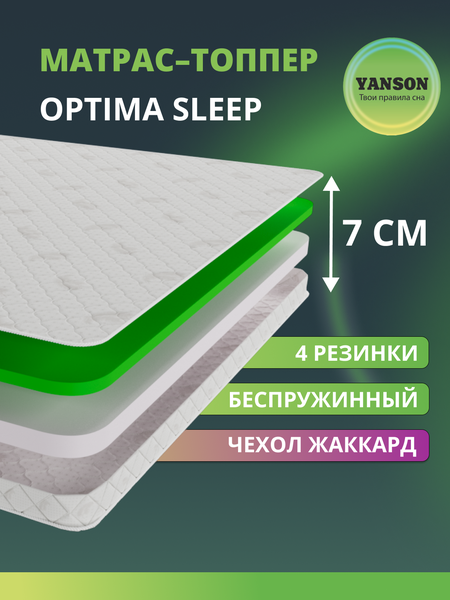 Матрас – топпер YANSON Optima Sleep высотой 6 см отличный вариант для повышения уровня комфорта вашего матраса или дивана. Optima Sleep беспружинный матрас, в его составе современная пена ППУ- искусственный гипаалергенный материал, обладающий достаточной упругостью, эластичностью и мягкостью. Прочный, долговечный, хорошо пропускает воздух, способен быстро восстанавливать форму после деформаций. Материал Струтто это нетканый наполнитель нового поколения, по своей упругости не отличается от кокосовой койры. Струтто не впитывает запахи, он отталкивает влагу. Матрас будет идеален для использования, как в помещениях, так и под открытым небом. Струтто экологичный и безопасный материала не вызывает раздражений и аллергических реакций. Его можно рекомендовать детям. Матрас двухсторонний, с одной стороны средний а другая сторон выше средней. Чехол матраса YANSON, это современная тканть, состоящее из прочного эластичного волокна, чехол Трикот простеган на гипоаллергенном волокне, что придает его поверхности дополнительный уют и комфорт, такая ткань позволит прослужить вашему матрасу дольше. Матрас двухсторонний, жесткость сторон средняя и выше средней. Матрас поставляется в скрутке. Состав: Чехол по 0,5 см с двух сторон Струтто 3 см Пена Balance Foam 2см. Жесткость: 1 сторона - полужесткая; 2 сторона - средняя. Нагрузка на спальное место: 95 кг. Высота: 6 см. Матрас доставляется в производственной вакуумной упаковке, в рулоне.