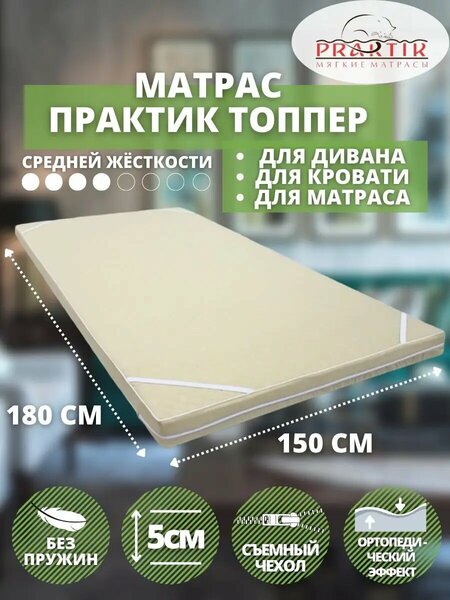 Топпер Практик со съёмным чехлом идеально подойдет для дивана, кровати и основного матраса, если Вам нужно сгладить неровности спального места, или обновить уже имеющийся матрас. Основа изделия - монолитная плита из Холкона, уникального гипоаллергенного, экологически чистого материала, который не имеет запаха, не токсичен. Мягкий на ощупь, моментально возвращающийся в начальное положение. Холкон не мнется, не усаживается, не сползает, обеспечивает оптимальную поддержку и правильное положение позвоночника во время сна, снимает нагрузку с суставов за счет ортопедического эффекта. Вы спите лучше и быстрее высыпаетесь. Чехол съемный, на молнии, имеет четыре резинки по углам для крепления. Купить наш топпер - это простое и выгодное решение для здорового сна. Матрас односпальный: матрас топпер 70х200; матрас топпер 80х200; матрас топпер 90х200. Матрас полуторка: матрас топпер 120х200; матрас топпер 140х200; матрас топпер 150х200. Матрас двуспальный: матрас топпер 160х200; матрас топпер 180х200. Матрас тонкий 5 см. в чистом без канта, но достаточный что бы справляться с высокими нагрузками.
