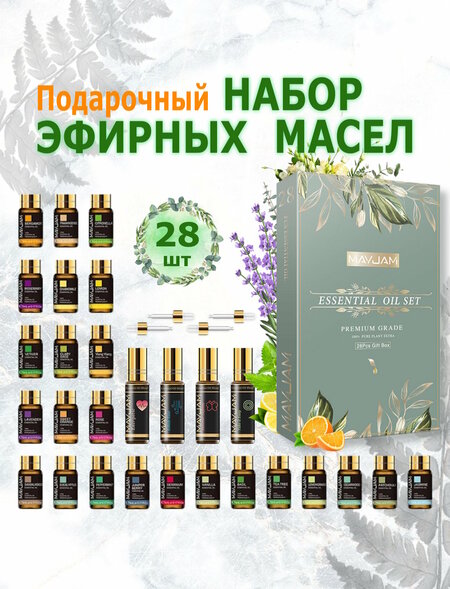 Эфирные масла от компании MAYJAY это премиальный подарочный набор из 28 натуральных эфирных масел по 5мл для аромадиффузоров, аромалампы, увлажнителей воздуха, кожи, волос, лица и тела, бани, сауны, ванны, массажа, йоги и авто ароматизаторов. Эфирные масла широко применяются для оздоровления, очищения и расслабления организма, снятия усталости, стресса, улучшения самочувствия и настроения, поднятия тонуса и иммунитета. Определенные масла оказывают противомикробный эффект и являются профилактикой гриппа и простуды. Добавление нескольких капель создаст неповторимый аромат растений, фруктов, цветов и специй, так же вы сможете создать свой уникальный не повторимый аромат смешав несколько масел. В наборе 28шт по 5мл Состав ароматов: