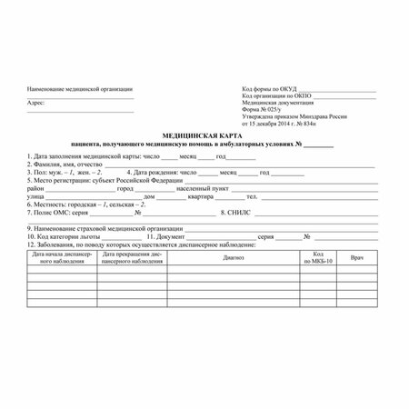 Медицинская карта пациента № 025-У предназначена для ведения учета в амбулаторных условиях. Она выполнена в формате А5, что делает ее удобной для хранения и переноски. В комплекте 10 штук, что позволяет обеспечить всех пациентов медицинской организации. Карта заполняется на каждого впервые обратившегося за медицинской помощью пациента. На титульном листе проставляется полное наименование медицинской организации. Это позволяет быстро и легко идентифицировать пациента. Медицинская карта выполнена на офсетной бумаге, что обеспечивает ее долговечность и устойчивость к влаге. Тип крепления - скрепки, что обеспечивает надежное крепление листов и предотвращает их случайное выпадение. Медицинская карта предназначена для пациентов разных возрастов: от 0 до 14 лет. Это позволяет использовать ее в различных медицинских учреждениях и для разных возрастных групп. Комплект медицинской карты № 025-У предназначен для использования в сфере здравоохранения. Это гарантирует высокое качество и соответствие стандартам. Выбирая медицинскую карту пациента № 025-У, вы получаете удобный и надежный инструмент для ведения учета в медицинских учреждениях.