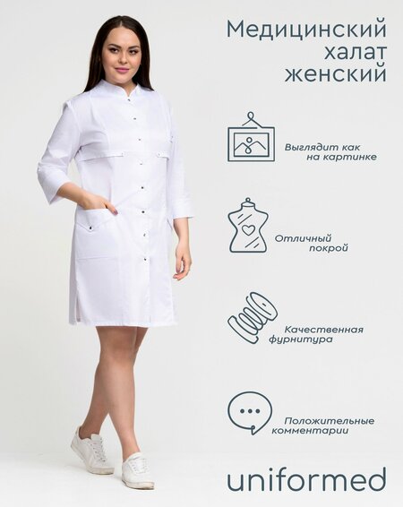 Халат выполнен из качественных материалов, имеет прилегающий силуэт, центральную бортовую застежку на кнопке и отрезную кокетку под грудью. Вертикальные рельефы на полочке и спинке создают идеальную посадку, а планка с хольнитенами придает дополнительный шик. Боковые карманы на клапанах на кнопке гарантируют удобство хранения мелких вещей, а воротник-стойка обеспечивает комфортную посадку. Рукава длиной 3/4 на манжете и разрезы по бокам делают этот халат еще более удобным и функциональным. Не упустите свой шанс выглядеть стильно и уверенно на работе!
