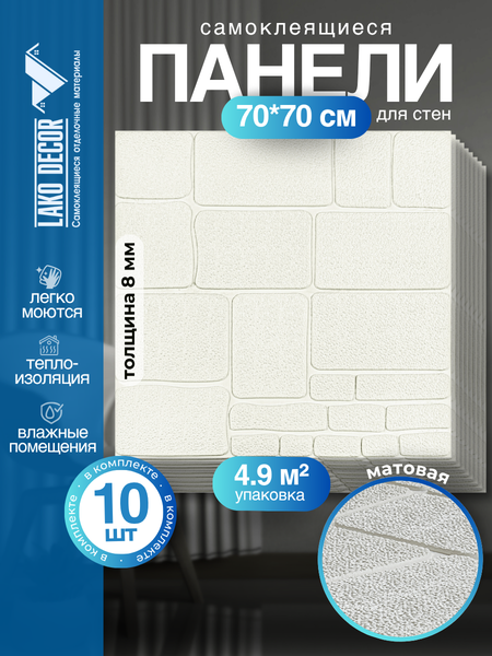 Мега-комплект 10 шт. Самоклеящихся 3D панелей Lako Decor позволяет быстро и очень просто обновить интерьер своими руками без использования специализированных инструментов. Стеновые панели обладают рельефным рисунком и прекрасно маскируют небольшие дефекты поверхностей. Могут использоваться для декора стен, потолков, для зонирования пространства. С монтажом справится даже непрофессионал - достаточно отделить защитный слой и прижать клейкой стороной к подготовленной поверхности. Не нужно покупать клей, ведь он уже нанесен, благодаря этому время монтажа одной панели занимает несколько минут. Широкая гамма фактур с имитацией природных материалов (камень, дерево) позволяет создавать различные по стилю интерьеры. Вы с лёгкостью сможете изменить декор своего балкона, кухни, спальни, детской комнаты, а высокая влагостойкость материала поможет справится с любыми нестандартными решениями. Вдохновляйся и создавай интерьер своей мечты! Особенности: ●Рельефный рисунок ●Легкий и быстрый монтаж (клеевой слой уже нанесен, специальные инструменты не нужны). ●Возможно применение в помещениях с повышенной влажностью (ванная, балкон, лоджия, технические помещения). ●Применяется в качестве панелей для стен: в гостиной, детской, прихожей, в зоне кухонного фартука. ●Клеится на ровную сухую жесткую поверхность после удаления пыли (ОСБ, фанера, бетон, штукатурка). ●Стыковка панелей с 4-х сторон без подбора рисунка. ●Не требует применения клея или герметика при использовании в сухих помещениях (при использовании в помещениях с повышенной влажностью рекомендуется использование герметика на стыках материала). ●Стеновые панели хорошо сочетаются с напольными покрытиями : керамической плиткой, керамогранитом, ламинатом, линолеумом, паркетом. ● В случае повреждения достаточно заменить одну панель без разбора всего настенного панно. ●Отсутствие неприятных запахов (материал полностью сертифицирован) ●Легкий уход (для очистки используются любые бытовые очистители без абразивов). важно: При размещении декоративных панелей на кухонном фартуке в зоне с газовой плитой рекомендуется использовать защитный экран из закаленного стекла.