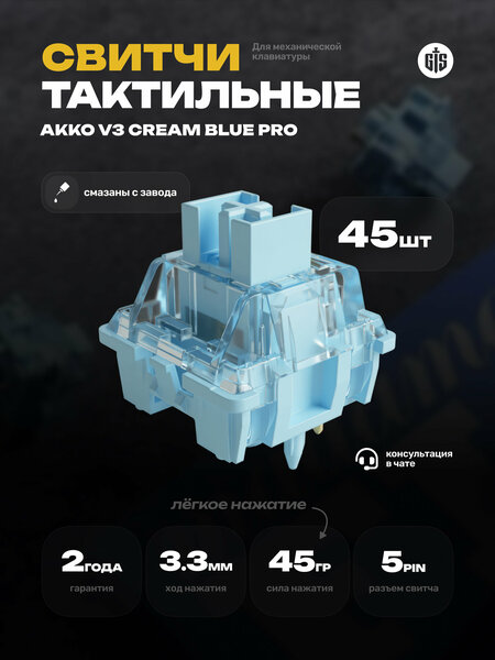 Механические переключатели Akko V3 Cream Blue PRO разработаны для обеспечения быстрого и отзывчивого набора текста. Характеристики: Бренд: Akko Модель: Cream Blue PRO Тип: Тактильный Разъем: 5 pin Пружина: 38 гр Усилие бампа: 45 гр Расстояние срабатывания: 2мм Общее расстояние: 3.5мм Смазаны с завода Долговечность: 60 миллионов раз Материал: Верхний хаузинг PC | Нижний хаузинг PC | Стем POM В целом, механические свитчи Akko V3 Cream Blue Pro предлагают сочетание функциональности и эстетики, что делает их отличным выбором для тех, кто хочет обновить свою механическую клавиатуру. Благодаря плавности нажатия клавиш, долговечности и совместимости, они идеально подходят как для геймеров, так и для работы и любителей custom периферии.