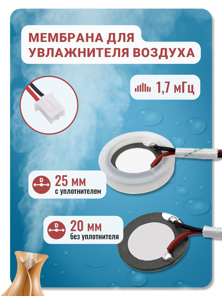 Универсальный ультразвуковой распылитель воды для увлажнителя воздуха с керамическом диском, проводами и разъемом для подключения. Диаметр 20 мм без уплотнителя, 25мм с уплотнителем, частота 1,7 мГц. Подходит для большинства увлажнителей с указанными характеристиками мембраны. По внешнему виду и цвету диск может отличаться от вашего. В комплекте 1 штука. Резонансная частота: 1,7 мГц. Резонансное сопротивление: 3 Ом макс. Входное напряжение: 24- 38 В, постоянный ток. Срок службы: более 5 000 ч. Распыление: 250 мл/час. Длина проводов: 70 мм