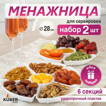 Менажница "Сияние" от Kuber Home - это незаменимый аксессуар для сервировки стола и подачи блюд. Менажница представляет собой набор тарелок с секциями, что позволяет красиво подать закуски, салаты, соленья, фрукты и сладости. Она также подходит для нарезки из сыра и колбасы, конфет и орехов. Менажница выполнена из качественного ударопрочного пластика, что делает ее долговечной и безопасной. Благодаря этому, она станет незаменимым помощником на кухне, даче, пикнике и даже в кафе. Современный дизайн и эстетичный внешний вид делают менажницу "Сияние" отличным выбором для дома. Благодаря белому и черному цвету, она прекрасно впишется в любой интерьер. Менажница легко моется и устойчиво стоит на столе, что обеспечивает удобство использования. Приобретая менажницу в качестве подарка, вы обязательно порадуете своих близких. Она станет прекрасным декором стола на юбилее, корпоративе, вечеринке и других праздниках. Выбирая менажницу "Сияние" от Kuber Home, вы получаете стильный, функциональный и долговечный аксессуар для сервировки стола и подачи блюд.