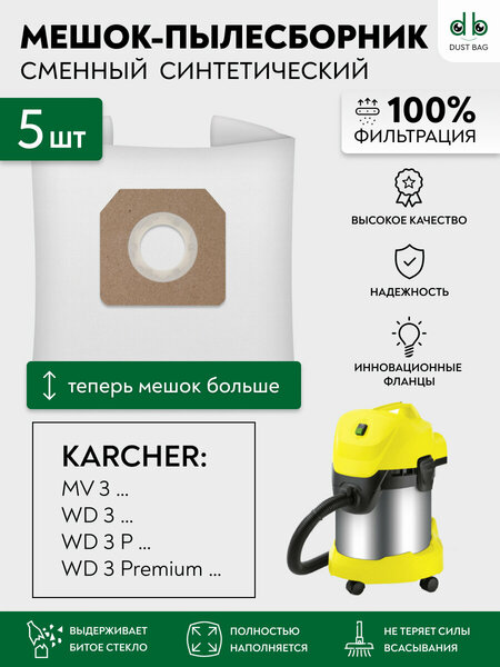 Сменные синтетические мешки для пылесоса европейского качества бренда DUST BAG разработаны специально для пылесосов марки KARCHER указанного ниже модельного ряда. 3 слоя нетканного синтетического микроволокна обеспечивают высокий уровень фильтрации. Мешки для пылесоса способны выдерживать острые предметы, осколки стекол, строительный мусор, бытовую пыль и прочие виды мусора. Высокотехнологичные фланцы, внимание к деталям и работа с обратной связью делает пылесборники для пылесоса бренда DUST BAG лучшим решением для защиты вашего пылесоса при строительных, ремонтных, уборочных и прочих работах. В ассортименте магазина вы найдете одноразовые мешки синтетические и бумажные, многоразовые мешки разного вида закрытия (на молнии, липучке, зажиме) высокого класса фильтрации. А также фильтры складчатые и патронные, бумажные и синтетические. Задайте вопрос нашему специалисту или же ознакомьтесь на витрине нашего магазина. Мешки для пылесоса: • KARCHER: MV 3 MV 3 CAR KIT MV 3 DAKAR MV 3 FIREPLACE KIT MV 3 P MV 3 P EXTENSION KIT MV 3 PREMIUM MV 3 PREMIUM CAR KIT MV 3 PREMIUM FIREPLACE KIT WD 3 … WD 3 CAR KIT WD 3 DAKAR WD 3 EU II WD 3 FIREPLACE KIT WD 3 P WD 3 P EXTENSION KIT EU II WD 3 Premium WD 3 Premium Car Football Edition WD 3 Premium Car kit WD 3 Premium Car Extension kit WD 3 Premium Home WD 3 Premium Jubilee WD 3 Suction Brush Синтетические мешки для оригинальных немецких пылесосов KARCHER (Керхер) серии WD 3 и MV3, незаменимы в работе с повышенной требовательностью к чистоте и при использовании профессионального инструмента.