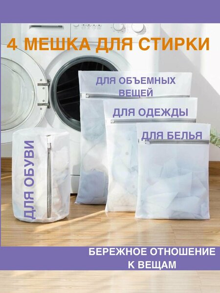 Мешок (сетка) для стирки белья и одежды вещей, а также обуви или сменки и нижнего белья и бюстгалтеров, кроме того игрушек и постельного белья пледов подушек в стиральной машине. Незаменимый аксессуар в хозяйственных товарах для дома. Позволяет продлить жизненный цикл изделиям из ткани, обеспечивая бережную стирку в стиральной машине и при деликатной стирке. Может использоваться как чехол для хранения. В нашем наборе 4 штуки разных размеров и формы с застежкой на молнии, что позволяет стирать различные предметы, верхнюю одежду - пуховик и куртку, а также сортировать их по цветам. Изделия изготовлены из высококачественного синтетического материала, все внутренние швы обработаны тесьмой, хвостик молнии выполнен из пластика, для него есть потайной карман. Основные преимущества в использовании: сохраняют форму стираемого, предотвращают деформацию трикотажа и запутывание шнурков, тесьмы, крючков и т. п. уменьшают вибрацию стиральной машины за счет лучшего распределения веса. Мелкая фурнитура, случайно оторвавшись, останется в мешке, не повредит стиральную машину и не придется производить ее очистку. Рассчитаны на длительный срок службы. Рекомендации по применению: для получения наилучших результатов при стирке не рекомендуется заполнять сетку не более, чем на три четверти его объема. Материал – полиэстер. Особых требований по хранению и эксплуатации нет. Купить набор мешков для стирки можно недорого в нашем магазине на Ядекс. Маркет