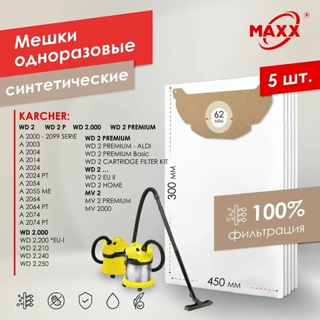 Меняйте мешки вовремя и ваш пылесос будет работать эффективно. Мешки MAXX для пылесоса разработаны для вашего пылесоса. Одноразовые мешки удобны в использовании. Специальный синтетический материал обеспечивает надежное удержание пыли и грязи, делая уборку легкой и быстрой. Универсальные модели подходят для указанных пылесосов. Они отлично справляются с задачей фильтрации загрязнений, устойчивы к важному мусору в отличие от бумажных пылесборников. Одноразовые универсальные фильтр мешки просты в замене: просто выбросьте старый пылесборник, установите новый - и готово. Универсальные одноразовые варианты экономят ваше время. Сменные мешки просты в использовании и обладают повышенной фильтрацией. Это важно для здоровья семьи и персонала. Синтетический фильтр качественно защищает двигатель вашего пылесоса, продлевая его срок службы, благодаря высоким фильтрующим свойствам и высокому содержания мельтблауна. Пыль больше не станет проблемой: мощный мешок для улавливания всех мелких частиц позаботится об этом. Пылесборники легко фиксируются внутри пылесоса, обеспечивая надежную работу без потерь мощности всасывания. Комплектация: 5 одноразовых мешков для пылесоса. Мешки для пылесоса: • KARCHER: A 2000 - 2099 SERIE A 2003 A 2004 A 2014 A 2024 A 2024 PT A 2054 A 2055 ME A 2064 A 2064 PT A 2074 A 2074 PT MV 2 MV 2 PREMIUM MV 2000 WD 2 … WD 2 EU II WD 2 HOME WD 2 PREMIUM WD 2 PREMIUM - ALDI WD 2 PREMIUM Basic WD 2 CARTRIDGE FILTER KIT WD 2.000 WD 2.200 *EU-I WD 2.210 WD 2.240 WD 2.250 6.904-322.0 6904-3220 69043220 KFI 222 1.629-100.0 1629-1000 16291000 1.629-300.0 1629-3000 16293000 1.629-783.0 1629-7830 16297830 1.629-764.0 1629-7640 16297640 1.629-773.0 1629-7730 16297730 1.629-780.0 1629-7800 16297800 1.629-550.0 1629-5500 16295500