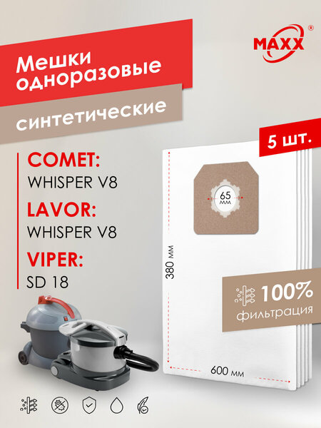 Меняйте мешки вовремя и ваш пылесос будет работать эффективно. Мешки MAXX для пылесоса разработаны для вашего пылесоса. Одноразовые мешки удобны в использовании. Специальный синтетический материал обеспечивает надежное удержание пыли и грязи, делая уборку легкой и быстрой. Универсальные модели подходят для указанных пылесосов. Они отлично справляются с задачей фильтрации загрязнений, устойчивы к важному мусору в отличие от бумажных пылесборников. Одноразовые универсальные фильтр мешки просты в замене: просто выбросьте старый пылесборник, установите новый - и готово. Универсальные одноразовые варианты экономят ваше время. Сменные мешки просты в использовании и обладают повышенной фильтрацией. Это важно для здоровья семьи и персонала. Синтетический фильтр качественно защищает двигатель вашего пылесоса, продлевая его срок службы, благодаря высоким фильтрующим свойствам и высокому содержания мельтблауна. Пыль больше не станет проблемой: мощный мешок для улавливания всех мелких частиц позаботится об этом. Пылесборники легко фиксируются внутри пылесоса, обеспечивая надежную работу без потерь мощности всасывания. Комплектация: 5 одноразовых мешков для пылесоса. Мешки для пылесоса: • COMET: WHISPER V8 9351000100 3050002400 • LAVOR: WHISPER V8 8.214.0601 82140601 5.212.0023 52120023 • VIPER: SD 18 50000000 50000291 VA61309