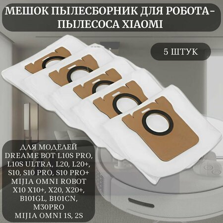 Мешок пылесборник для робота-пылесоса Xiaomi Dreame Bot L10s Pro L10s Ultra, Mijia Omni Robot X10 X10+ X20 X20+ B101GL B101CN, Mijia Omni 1S 2S - это идеальный аксессуар для поддержания чистоты и эффективности вашего устройства. В наборе представлено 5 высококачественных мешков, которые помогут вашему роботу-пылесосу справляться с уборкой на высшем уровне. Эти пылесборники легко устанавливаются и заменяются, что экономит ваше время и усилия при техническом обслуживании робота-пылесоса. Они идеально подходят как для регулярной, так и для интенсивной уборки, гарантируя бесперебойное функционирование вашего устройства. Комплект из 5-ти мешков-пылесборников, которые совместимы со следующими моделями робот-пылесосов: