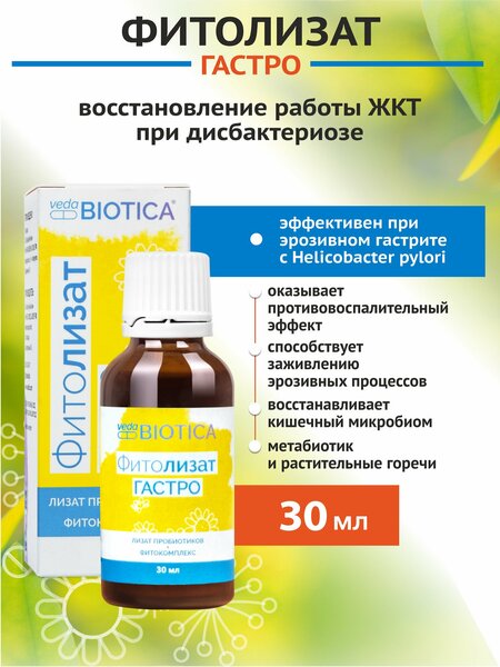 Нерациональное питание, стрессы, малоподвижный образ жизни, частые респираторные инфекции и прием лекарственных препаратов приводят к нарушению состояния микробиоты кишечника. В результате в организме человека возникают длительные воспалительные процессы, усиливается рост патогенной микрофлоры, возникает сибр-синдром (синдром избыточного бактериального роста), ВЗК (воспалительные заболевания кишечника), спазмы и боли, дисбактериоз, СРК (синдром раздраженного кишечника), снижается иммунитет. Для поддержания правильной работы желудочно-кишечного тракта современному человеку необходимо периодически принимать пробиотики, пребиотики, а также метабиотики (лизаты бифидобактерий, лактобактерий и пропионовокислых бактерий). ФитолизатГастро – инновационный отечественный продукт нового поколения, объединяющий в своей формуле возможности метабиотиков (лизатов пробиотических бактерий) с лечебными свойствами лекарственных растений. Комплексное действие препарата заключается в иммуномодулирующем, антибактериальном, противовоспалительном действии лизатов, которые позволяют бороться с патогенными и условно-патогенными микроорганизмами, поддерживая при этом рост и развитие полезной микрофлоры кишечника. Положительное действие лизатов дополняется лечебными свойствами лекарственных растений, в виде многофакторной коррекции отклонений в работе желудочно-кишечного тракта. Благодаря активным компонентам, продукт: - Снижает риск развития заболеваний ЖКТ - Нормализует перистальтику кишечника - Снижает воспаление - Нормализует баланс микрофлоры - Оказывает антибактериальное действие - Стимулирует иммунитет