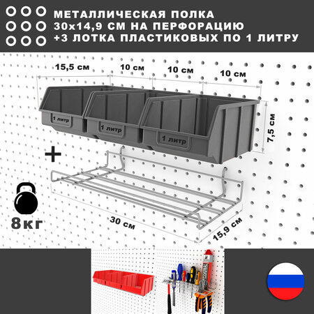 Цвет лотков - серый. Нагрузка - 6 кг. Размер комплекта 30*17*8 см. Лотки обьемом по 1 литру каждый. Материал -полипропилен марок А1 - А6. Общий обьем лотков - 3 литра. Материал полки - проволока 3 и 4 мм. ГОСТ 3282-74. Покрытие - полимерное. Вес - 415 грамм. Металлическая полка для настенной навески на перфорацию перфопанели с шагом между отверстиями Ø 2,5 см. Выступает в роли полки, подставки для контейнеров, лотков, основания для хранения инструментов (молотки, отвертки, пассатижи, кусачки, столярный инструмент и т. п.). Используется как универсальный подвес на перфорированных панелях органайзерах и систем хранения. Лотки пластиковые объемом по 1 литру - для хранение метизов, мелких деталей. Данный аксессуар позволяет организовать и оптимизировать рабочую зону дома, в гараже и мастерской. Настенный органайзер для хранения инструментов, вещей. Перфорированная система хранения, настенная. В нашем магазине возможно укомплектовать перфопанель аксессуарами под ваши требования. Настенные перфорированные панели, крючки металлические , держатели и подвесы, полка для инструментов, корзина и контейнер для хранения. Перфорированная панель органайзер для инструментов используют для хранения инструментов и вещей дома, гараже, рабочем месте и на даче. Помогает экономить и содержать в порядке рабочее место. Полка металлическая / Крючки металлические настенные / Держатель для инструментов / Подвес для хранения инструментов / Хранение инструментов и вещей / Органайзер для инструментов