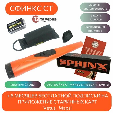 + 6 месяцев бесплатной подписки на приложение старинных карт Vetus Maps - талон с промокодом в комплекте! Металлодетектор ручной (пинпойнтер) сфинкс СТ (SPHINX ST) предназначен для поиска и локализации в слабопроводящих и диэлектрических средах металлических предметов из черных и цветных металлов. Режим работы статический. Выпускается в оранжевом цвете с черной оконтовкой вокруг кнопки. Технические характеристики Частота 12 кГц 1 режим чувствительности Звуковая и/или вибро идентификация Подсветка (фонарик) для работы в малоосвещенном месте Автоматическая и ручная отстройка от грунта Обнаружение по всей антенне на 360 градусов Индикация разряда батареи Режим "Потери" - короткая звуковая сигнализация (1 раз в 10 секунд) в течение 40 минут. Сохранение предыдущих настроек при выключении прибора Ударопрочный корпус из пластика ABSРабочие температуры от - 15 до +60 Водозащита по стандарту IP68 (погружение под воду до 3 м) Цвет: оранжевый (с черном обводом кнопки и черной крышкой) Комплектация Пинпоинтер Sphinx CT Кобура Защитный носик-насадка Батарея солевая Паспорт/инструкция Гарантия 2 года