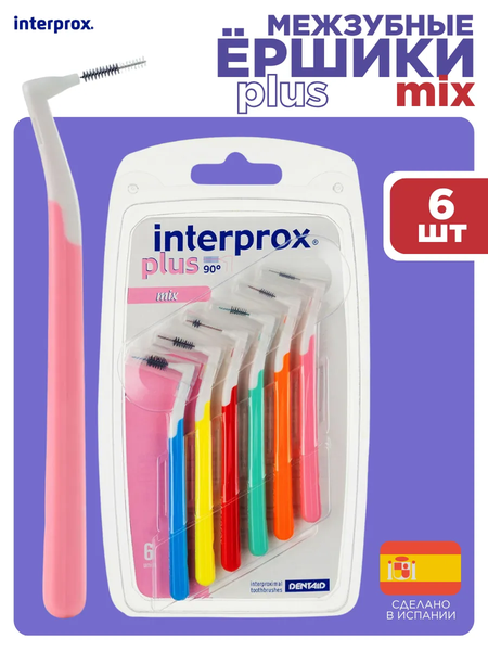 Набор Interprox Plus Mix состоит из 6 ершиков с разными диаметрами стержня и щетинок. У каждого ершика есть защитный колпачок. Межзубные ершики помогают удалить налет, уменьшить кровоточивость десен и предотвратить неприятный запах изо рта. Подходят для очистки имплантатов и брекет-систем. Ручка и головка ершиков расположены под углом 90°, что облегчает процесс чистки. Щетинки, изготовленные из нейлона Tynex®, двухцветные: черные щетинки показывают удаленный зубной налет, белые - кровоточивость десен. Гибкая каркасная проволока покрыта полиуретаном, поэтому не царапает эмаль и десна. * Nano (розовый)- диаметр стержня 0,38 мм, диаметр щетины 1,9 мм * Super Micro (оранжевый)- диаметр стержня 0,5 мм, диаметр щетины 2 мм * Micro (бирюзовый)- диаметр стержня 0,56 мм, диаметр щетины 2,4 мм * Mini Conical (красный)- диаметр стержня 0,6 мм, диаметр щетины 2-4 мм * Mini (желтый)- диаметр стержня 0,7 мм, диаметр щетины 3 мм * Conical (синий)- диаметр стержня 0,8 мм, диаметр щетины 3-5 мм Способ применения Использовать не реже одного раза в день, желательно вечером. Осторожно введите ершик в межзубное пространство. Чистить возвратно-поступательными движениями. После использования промойте ершик водой.