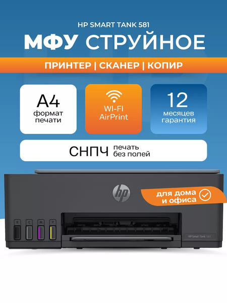 МФУ струйное HP Smart Tank 581 - это многофункциональное устройство, которое сочетает в себе функции принтера, сканера и копира. Оно обеспечивает высокое качество печати благодаря струйной технологии и системе непрерывной подачи чернил. Устройство поддерживает различные типы печатных носителей, включая обычную бумагу, матовую бумагу для брошюр, глянцевую бумагу для брошюр, фотобумагу, конверты и другие типы бумаги для струйной печати. HP Smart Tank 581 имеет монохромный и цветной режимы печати, что позволяет пользователям выбирать между различными вариантами в зависимости от своих потребностей. Скорость печати составляет до 12 страниц в минуту в цветном и до 20 страниц в минуту в черно-белом формате. МФУ оснащено планшетным сканером с оптическим разрешением 1200x1200 т/д. Это позволяет сканировать документы с высоким качеством и детализацией. Скорость сканирования составляет до 10 страниц в минуту в цветном и до 10 страниц в минуту в черно-белом формате. Устройство имеет компактные размеры и легко устанавливается на рабочем столе. Оно совместимо с операционными системами Windows и MacOS, а также поддерживает прямую печать. МФУ HP Smart Tank 581 обеспечивает высокую скорость печати, отличное качество сканирования и копирования, а также возможность печати на различных носителях. Это делает его отличным выбором для домашнего и офисного использования.