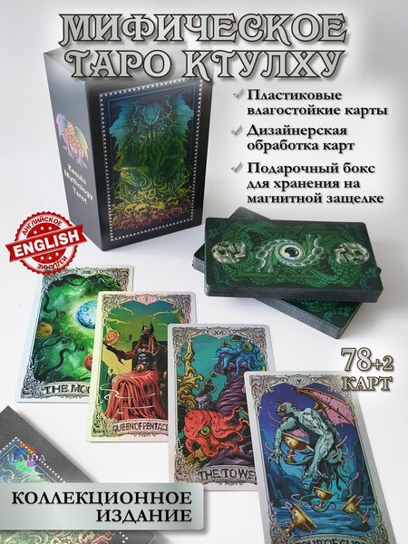 Погрузитесь в завораживающий мир Мифического Таро Ктулху Владыки Злых Духов в Серебряном издании! Прикоснитесь к чему-то действительно мрачному и в тоже время захватывающему. Коллекционная колода карт Таро Ктулху точно не оставит равнодушным фанатов Лавкрафта, а так же ценителей таро и обязательно вызовет “вау” эффект с первой минуты обладания столь уникальным продуктом. Потрясающая по своей красоте колода, посвященная мирам Лавкрафта. Таро имеет структуру Таро Уэйта, но в сюжете арканов изображены другие миры и существа. Карты фактурные, металлизированные и водонепроницаемые, очень приятные наощупь. Они тонкие и их очень легко перетасовывать. Эти карты обладают красивым голографическим эффектом, который проявляется, когда на карты падают лучи света. Рисунки на картах «оживают» и «загораются» другими цветами в зависимости от угла освещения – выглядит это очень эффектно. Карты изготовлены из ABS-пластика, который обладает водонепроницаемостью, гибкостью и прочностью. Четкая яркая печать без выцветания, с идеально ровной резкой. В комплекте идёт 78 карт + 2 дополнительные рекламные, удобный и красивый бокс для хранения карт на магнитной защелке, мини-инструкция на английском языке. Названия арканов на картах выполнены на английском языке. Размер карт классический - 12х7см. Подарочная коробка на магнитной защелке станет удобным футляром для хранения карт. Набор с Таро для гадания мы также дополнительно упаковываем в картонную гофрокоробку для защиты от повреждений при транспортировке к покупателю. Коллекционное Серебряное Таро Ктулху станет отличным подарочным вариантом для практикующих тарологов и любителей гаданий, эзотериков. Такую колоду приятно иметь в коллекции или в качестве сувенира, а также приобрести в подарок тем кто увлекается эзотерикой, гаданием, магией. Обращаем внимание, что данная колода выпускается только на английском языке, инструкция к ней также прилагается на английском.