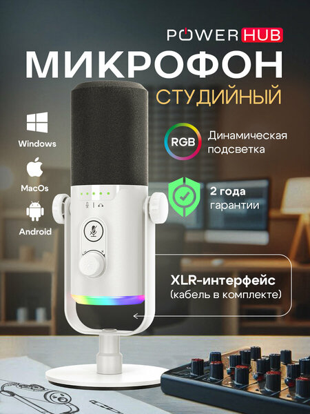Микрофон студийный игровой белый для ПК/iPhone/Android с RGB-подсветкой
