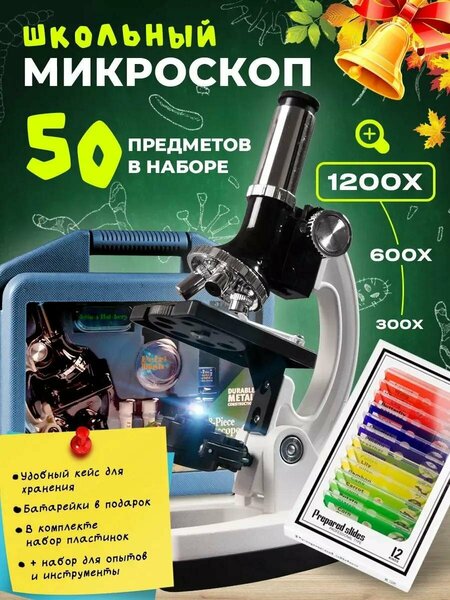 Школьный микроскоп с увеличением до 1200x – набор из 50 предметов