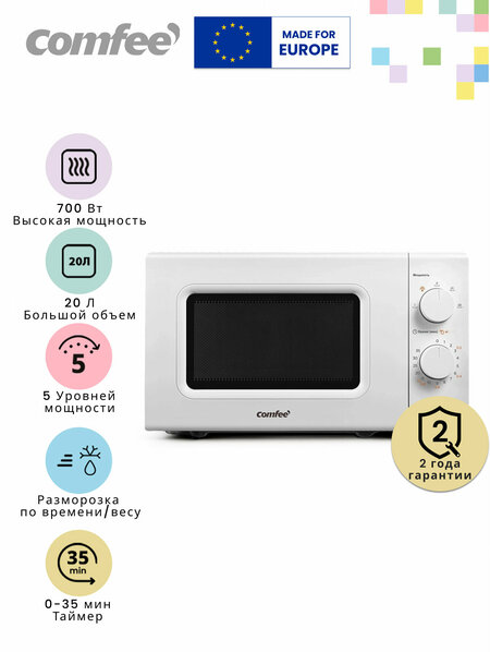 Микроволновая печь Comfee CMW207M03W - это современное и функциональное устройство, которое станет незаменимым помощником на вашей кухне. мощность И большой объем Объем печи составляет 20 литров, что позволяет готовить или разогревать большое количество пищи за один раз. Мощность микроволн в 700 Вт обеспечивает быстрый и равномерный нагрев продуктов. 5 уровней мощности Устройство оснащено 5 уровнями мощности, что дает возможность выбрать оптимальный режим для приготовления различных блюд. разморозка Печь оснащена режимом разморозки по весу, что позволяет быстро и равномерно разморозить продукты, сохраняя их полезные свойства и вкусовые качества. простота использования Дверца микроволновой печи навесная и открывается кнопкой. Это обеспечивает удобство использования и безопасность при эксплуатации. Устройство также имеет поворотные механические переключатели, звуковой сигнал отключения и дополнительные режимы работы. легкая очистка Внутреннее покрытие камеры, выполненное из эмали, гарантирует легкость очистки и долговечность использования. компактность И стильный дизайн Микроволновая печь Comfee CMW207M03W выполнена в белом цвете, что позволяет ей гармонично вписаться в любой интерьер кухни. Компактные размеры печи делают ее удобной для перемещения и установки на любой кухне. Выбирая микроволновую печь Comfee CMW207M03W, вы получаете технологичное решение, которое облегчит процесс приготовления и разогрева пищи, а также сэкономит ваше время.