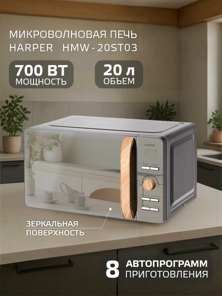 Микроволновая печь Harper HMW-20ST03 – это стильный и многофункциональный кухонный прибор, который позволит быстро разморозить продукты или разогреть еду, а также приготовить различные блюда. Вы можете выбрать одну из 8 программ автоматического приготовления, а для приготовления собственных рецептов используйте ручную настройку мощности (5 режимов) и времени (таймером до 60 минут). Более того, вы можете задать сложный алгоритм работы: до 4 этапов приготовления с разным временем и мощностью. Для удобства использования в СВЧ Harper HMW-20ST03 предусмотрена функция отложенного старта и 3 режима разморозки: для мяса, курицы и рыбы. При достаточной вместительности (объём камеры 20 литров), микроволновка Harper HMW-20ST03 имеет оптимальные габариты и отлично вписывается в интерьер небольших помещений: квартиры-студии, на офисной или дачной кухне. Корпус микроволновки может быть бежевым или серым, а ручка дверцы и регулятор времени стилизован под дерево.