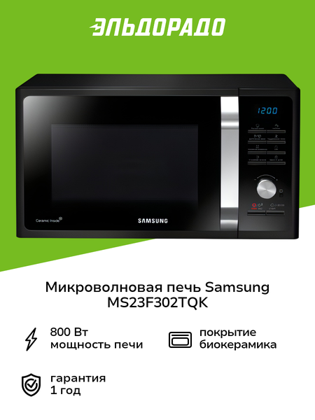 Микроволновая печь Samsung MS23F302TQK в черном корпусе оснащена электронной системой управления. Дверца открывается налево, с помощью внешней ручки. Объем камеры микроволновой печи составляет 23 л. Изнутри она покрыта биокерамической эмалью. Поворотный стол диаметром 28,8 см изготовлен из термостойкого стекла. При открывании дверцы загорается внутренняя подсветка. Микроволновая печь оснащена четырьмя программами автоматического размораживания продуктов, функцией поддержания температуры готового блюда. Присутствует режим удаления запахов. По окончании работы раздается звуковой сигнал. На корпусе микроволновой печи расположен дисплей с часами. Можно поставить модель на таймер. У микроволновой печи шесть уровней мощности. Общее энергопотребление составляет 1150 Вт. Мощность микроволн - 800 Вт.