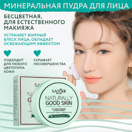 Минеральная пудра SADOER прекрасно выравнивает тон лица и матирует, придает коже приятную текстуру, делая ее гладкой и бархатистой. Минеральная косметика SADOER отлично освежает и устраняет все недостатки. Пудра бесцветная и подходит для любого типа кожи. Также пудра для лица рассыпчатая и мелкодисперсная, поэтому не забивает поры и отлично подстраивается под тон и цвет кожи. Sadoer Пудра для лица прозрачная и ложится тончайшей вуалью, если наносить кистью, не сушит и не стягивает кожу. Содержит минеральные ингредиенты для сохранения свежести и естественного вида вашей кожи. Используется также как фиксатор: пудра матирует кожу и сохраняет макияж, впитывает излишки кожного жира. Способ применения: после нанесения макияжа или процедур по уходу за кожей лица мягко распределите тонким слоем по всей необходимой области.
