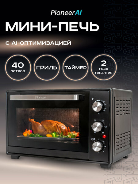 РАСШИРЕННАЯ ГАРАНТИЯ 2 ГОДА Электрическая печь Pioneer MO5019G — Прочная, вместительная и продуманная до деталей Максимум вкуса — минимум хлопот! Мини-печь Pioneer MO5019G black — результат AI-анализа 1,9 млн пользовательских запросов и отзывов о компактных духовках. Благодаря этому печь получила оптимальные характеристики: увеличенный объём 40 л, 6 режимов нагрева, двойное жаропрочное стекло, встроенный вертел и надежную механику. КЛЮЧЕВЫЕ ХАРАКТЕРИСТИКИ: Объем камеры печи: 40 литров Двойное жаропрочное стекло Тип управления: механический Максимальная потребляемая мощность: 1600 Вт ОБЛАСТИ ПРИМЕНЕНИЯ: Запекание Приготовление на гриле Приготовление на вертеле Приготовление тостов Выпекание ОСОБЕННОСТИ И ПРЕИМУЩЕСТВА: Стильный корпус Хромированная ручка дверцы Внутренняя подсветка Индикация включения 6 режимов переключения нагрева: выкл, верхний, нижний, верхний и нижний, верхний + вертел, верхний и нижний + вертел Температура нагрева: 100-250°С Таймер: до 60 минут Звуковой сигнал окончания приготовления ОСНАЩЕНИЕ: Хромированная ручка дверцы Металлическая решетка Плоский противень Ухват для противня Вертел Держатель для вертела Мини-печь Pioneer MO5019G black - это духовка компактного размера, которая является отличной заменой электрической или газовой плите на небольшой кухне или на даче. Она прекрасно справляется с приготовлением овощных, рыбных, мясных блюд или вкусной домашней выпечки. С современной электропечью от Pioneer вы сможет воплощать самые смелые кулинарные фантазии каждый день!