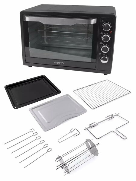 2700 Вт,65л, Мех. упр, Конвекция,4 нагр. элемента, Подсветка камеры,12 режимов, Темп:100-250°C, таймер 60мин, Звук. сигнал, Акс: шашлычница, вертел, эмал. противень, решетка, ручка, поддон для крошек, ручки хром. Данная модель оснащена: • 4 мощными нагревательными элементами суммарной мощностью 2700 Ватт; • Вместительной камерой и подсветкой объемом 65 литров; • 12 режимами работы, в том числе конвекцией, шашлычницей и вертелом; • Широким набором аксессуаров: шашлычница, вертел, эмалированный противень, решетка, ручка для извлечения противня/решетки, ручка для вертела, поддон для крошек. • Таймером со звуковым сигналом и автоматическим выключением прибора. Всё это сделает процесс приготовления горячей пищи удобным и быстрым! • Механическое управление делает простым и понятным выбор среди широкого набора настроек. • Вместительная камера объемом 65 литров позволит одновременно готовить несколько блюд и вмещает продукты большого размера, таких как целая тушка птицы, большой мясной рулет или пирог для всей семьи. Четыре мощных нагревательных элемента в совокупности с режимом конвекции особенно быстро прогревают камеру, поэтому электрический духовой шкаф MARTA поможет Вам приготовить самые вкусные горячие блюда, домашнюю выпечку с румяной корочкой и бесчисленное множество разнообразных кулинарных шедевров без потери времени. • Режим конвекции избавляет от необходимости перемещения блюда и противня во время приготовления, так как обеспечивает постоянную циркуляцию горячего воздуха по всей внутренней камере, за счет чего достигается одинаковая температура нагрева блюда со всех сторон, что позволяет пище запекаться и покрываться румяной корочкой равномерно по всей поверхности. Мини печь настольная, электрический духовой шкаф, духовка