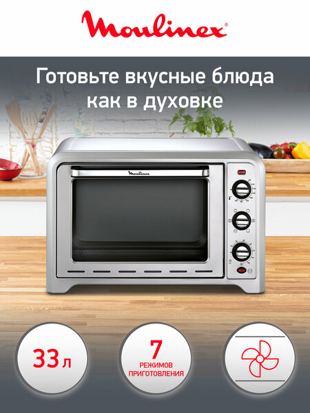 Многофункциональная и удобная печь для ежедневного использования Optimo 33 L – это простая компактная печь со встроенным вентилятором для ежедневного использования. Просто выберите температуру, время и один из семи режимов приготовления и наслаждайтесь своими любимыми блюдами. Конвекционная печь объемом 33 Л И 7 режимами приготовления Конвекционная печь Optimo предлагает 7 режимов приготовления для легкого приготовления ваших любимых блюд легкое управление Печь легко использовать благодаря 3 механическим кнопкам: Регулировка температуры до 240 градусов, Установка таймера до 120 мину, 7 режимов приготовления удобная печь Две двухстороннее решетки, противень для запекания и вертел современный дизайн Печь дополнит любую кухню благодаря современному классическому дизайну. Хромированные детали и ручка с покрытием из нержавеющей стали характеристики Бренд Moulinex Тип управления Механическое Объем 33 л Количество слоев стекла на дверце 2 слоя Внутренняя подсветка Есть Ремонтопригодность 10 лет Съемные части можно мыть в посудомоечной машине Есть Встроенные режим приготовления Конвекция/Гриль Мощность гриля 800 Вт Таймер есть Мощность 1600 Вт Легко использовать Таймер Максимальная температура 240°C Материал корпуса Нержавеющая сталь Количество режимов работы 7 Индикация Есть Страна производителя Китай Цвет Стальной Гарантия 2 года
