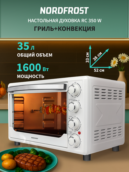 Электрическая мини-печь NORDFROST RC 350 – это компактная и функциональная настольная духовка, которая станет прекрасной альтернативой электрической или газовой плите на кухне. Модель RC 350 с объемом 35 л и мощностью 1.6кВт оснащена функцией конвекции, которая обеспечит быстрое и равномерное приготовление любимых блюд. Настольная духовка оснащена 3 режимами работы: верхний нагревательный элемент + гриль + конвекция; нижний нагревательный элемент + конвекция; верхний и нижний нагревательный элементы + гриль + конвекция. С помощью режима «Гриль» вращающимся вертелом, печь позволяет готовить мясо большим куском, целую курицу или рыбу с хрустящей золотистой корочкой. Наличие вертела обеспечит равномерную прожарку со всех сторон. Механическое управление настольной духовкой интуитивно понятное, осуществляется посредством регуляторов. Температура нагрева печи от 100 до 250 °С. Мини-печь оснащена таймером, которым можно запрограммировать точное время приготовления до 120 минут. Когда заданное время пройдет, таймер автоматически выключит духовку и напомнит об этом звуковым сигналом. Вместительный прямоугольный противень и решетку можно использовать для приготовления одновременно на разных уровнях духового шкафа. В комплекте идет ухват для противня и решетки, чтобы быстро и безопасно извлечь горячие блюда из духовки. Поддон для крошек позволяет сэкономить время на очистку духового шкафа и служит дополнительной защитой от возгорания остатков пищи, попадающих на нагревательный элемент. Термоустойчивый пластик ножек не оставляет царапин на столе и препятствует скольжению по поверхности. Высокие ножки способствуют уменьшению воздействия горячих температур на столешницу. Духовка внутри: оцинкованная сталь. . Электродуховка, благодаря своим небольшим размерам сохранит максимум пространства на кухне, как в городской квартире, так и в загородном доме. Стильная и современная мини-печь NORDFROST RC 350.