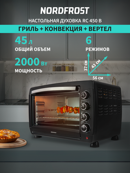 Электрическая мини-печь NORDFROST RC 450 B – это компактная и функциональная настольная духовка, которая станет прекрасной альтернативой электрической или газовой плите на кухне. Модель RC 450 B с объемом 45 л и мощностью 2кВт оснащена функцией конвекции, которая обеспечит быстрое и равномерное приготовление любимых блюд. Настольная духовка оснащена 3 режимами работы: верхний нагревательный элемент + гриль + конвекция; нижний нагревательный элемент + конвекция; верхний и нижний нагревательный элементы + гриль + конвекция. С помощью режима «Гриль» вращающимся вертелом, печь позволяет готовить мясо большим куском, целую курицу или рыбу с хрустящей золотистой корочкой. Наличие вертела обеспечит равномерную прожарку со всех сторон. Механическое управление настольной духовкой интуитивно понятное, осуществляется посредством регуляторов. Температура нагрева печи от 100 до 250 °С. Мини-печь оснащена таймером, которым можно запрограммировать точное время приготовления до 120 минут. Когда заданное время пройдет, таймер автоматически выключит духовку и напомнит об этом звуковым сигналом. Вместительный прямоугольный противень и решетку можно использовать для приготовления одновременно на разных уровнях духового шкафа. В комплекте идет ухват для противня и решетки, чтобы быстро и безопасно извлечь горячие блюда из духовки. Поддон для крошек позволяет сэкономить время на очистку духового шкафа и служит дополнительной защитой от возгорания остатков пищи, попадающих на нагревательный элемент. Термоустойчивый пластик ножек не оставляет царапин на столе и препятствует скольжению по поверхности. Высокие ножки способствуют уменьшению воздействия горячих температур на столешницу. Духовка внутри с антипригарным покрытием. Корпус духовки имеет внутренний слой теплоизоляции, которая предотвращает нагрев корпуса до высоких температур. Электродуховка, благодаря своим небольшим размерам сохранит максимум пространства на кухне, как в городской квартире, так и в загородном доме. Стильная и современная мини-печь NORDFROST RC 450 B выполнена в черном цвете.