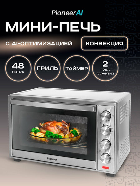 РАСШИРЕННАЯ ГАРАНТИЯ 2 ГОДА Мини-печь Pioneer MO5021G — Компактная универсальная духовка с грилем, конвекцией и вертелом Печь, гриль и вертел в одном корпусе: создано AI, одобрено поварами! Pioneer MO5021G — это мини-печь, созданная на базе анализа 1,2 миллиона пользовательских сценариев выпекания, жарки и запекания, чтобы стать универсальным помощником на кухне и даче. КЛЮЧЕВЫЕ ХАРАКТЕРИСТИКИ: Объем камеры печи: 48 литров. На основе 450 тысяч отзывов, оптимальный объём камеры для домашних нужд — 48 л. Двойное жаропрочное стекло AI-упрощённое управление: механические регуляторы и автоотключение. Простая система управления, оптимизированная по 890 тысячам запросов пользователей. Максимальная потребляемая мощность: 2000 Вт ОБЛАСТИ ПРИМЕНЕНИЯ: Запекание Приготовление на гриле Приготовление на вертеле Приготовление тостов Выпекание ОСОБЕННОСТИ И ПРЕИМУЩЕСТВА: Стильный корпус Внутреннее покрытие камеры: металл Внутренняя подсветка Индикация включения 4 режима переключения нагрева: выкл, верхний, нижний, верхний и нижний — всё, что нужно для равномерной термообработки. Специальная кнопка для включения вертела и конвекции обеспечивает ресторанное качество блю Специальная кнопка управления для гриля и конвекции Температура нагрева: 100-250 °С Таймер: до 60 минут АВТООТКЛЮЧЕНИЕ ПОСЛЕ СРАБАТЫВАНИЯ ТАЙМЕРА Звуковой сигнал окончания приготовления ОСНАЩЕНИЕ: Хромированная ручка дверцы и регуляторы панели управления Металлическая решетка Плоский противень Ухват для противня Вертел Держатель для вертела ГАБАРИТЫ: Корпус (ВхШхГ): 35.9х57,5х40.7 см Размер внутренней камеры: 43.3х34.2х31.5 см Расстояние между ножками по ширине - 46 см Поддон 43,3x31,3 см Решетка для гриля 43x31,2 см Длина шнура - 82,5 см Вес - 8,5 кг Мини-печь Pioneer MO5021G - это духовка компактного размера, которая является отличной заменой электрической или газовой плите на небольшой кухне или на даче. Она прекрасно справляется с приготовлением овощных, рыбных, мясных блюд или вкусной домашней выпечки. С современной электропечью от Pioneer вы сможет воплощать самые смелые кулинарные фантазии каждый день!