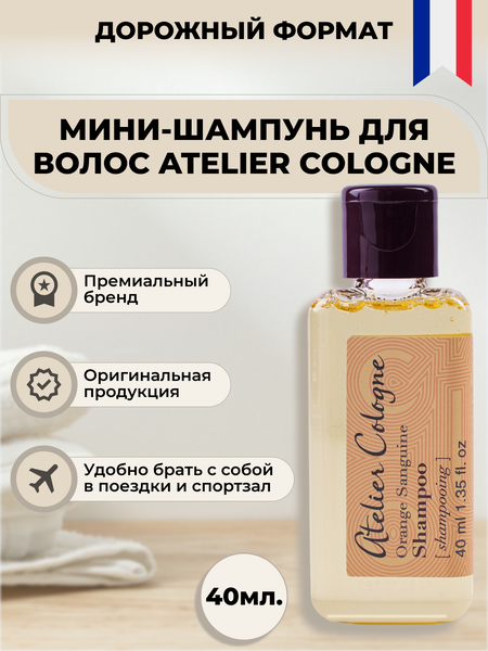 Мини-шампунь для волос Atelier Cologne Orange Sanguine Shampoo - это очищающий шампунь для стимуляции роста волос с экстрактом кедра и жасмином. Аромат красного апельсина гармонично сочетает яркие и свежие цитрусовые ноты. После применения волосы выглядят блестящими и ухоженными. Шампунь облегчает последующее расчесывание. Аромат принадлежит к группе цитрусовые. Подходит для всех типов волос. Верхняя нота — красный апельсин, горький апельсин и красный мандарин. Нота сердца — африканская герань, египетский жасмин и мадагаскарский перец. Базовая нота — сандал, амбра, бобы тонка и техасский кедр. Мини-шампунь для волос Atelier Cologne обладает бодрящим ароматом цитрусовых. Аромат шампуня - одинаково популярен как у мужчин, так и у женщин. После применения волосы становятся мягкими и послушными. Для большего эффекта этот шампунь рекомендуется использовать в паре с кондиционером Atelier Cologne. Шампунь подходит для жирных, сухих и кудрявых волос. Отлично ухаживает за секущимися, нормальными и окрашенными волосами. Парфюмированный мини шампунь обладает очищающими, освежающими, увлажняющими свойствами. После применения дорожного шампуня на волосах остаётся лёгкий освежающий аромат. Маленький формат шампуня для волос от будет удобен в туристическом путешествии, в командировке и в дороге. Очень удобный формат для использования в отеле, в поездке и в гостинице, а также на отдыхе. Мини версия шампуня в маленькой удобной упаковке флаконе, объемом 40 мл, более презентабельна и удобна чем шампунь пробник 50 мл. или шампунь в пакетиках. Возьмите с собой в гостиницу набор роскошной travel косметики от кутюр дорожного размера в миниатюре - это мини-шампунь, разовый мини-гель для душа и кондиционер для волос. Возьмите с собой в гостиницу набор роскошной travel косметики от кутюр дорожного размера в миниатюре - это мини-шампунь, разовый мини-гель для душа и кондиционер для волос.